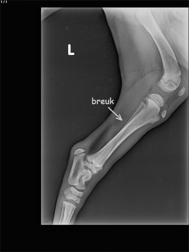 Een ongelukkig begin. Binnen een week pootje gebroken door een te woeste actie van Buck.